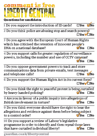 I haven't put yes or no for the question about police stop and search because it's more complex than that (I think it depends on the police officers and the situation, for example), and on the Human Rights Act I'm sure I would want to see changes to it, but this is a very broad question and it would depend on the particular issues we're discussing.